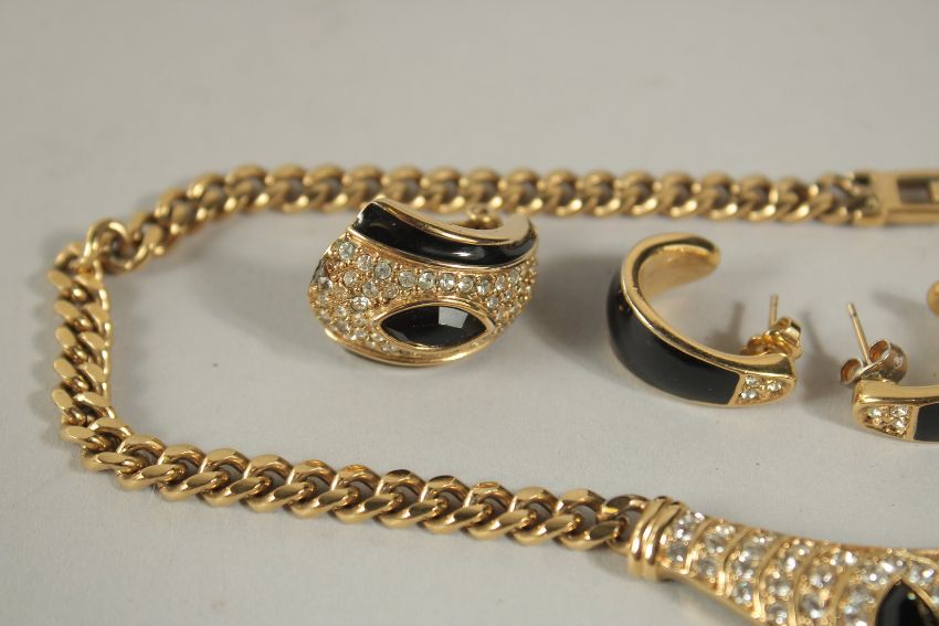 A DIAMANTE NECKLACE AND TWO PAIRS OF EARRINGS in a blue bag.