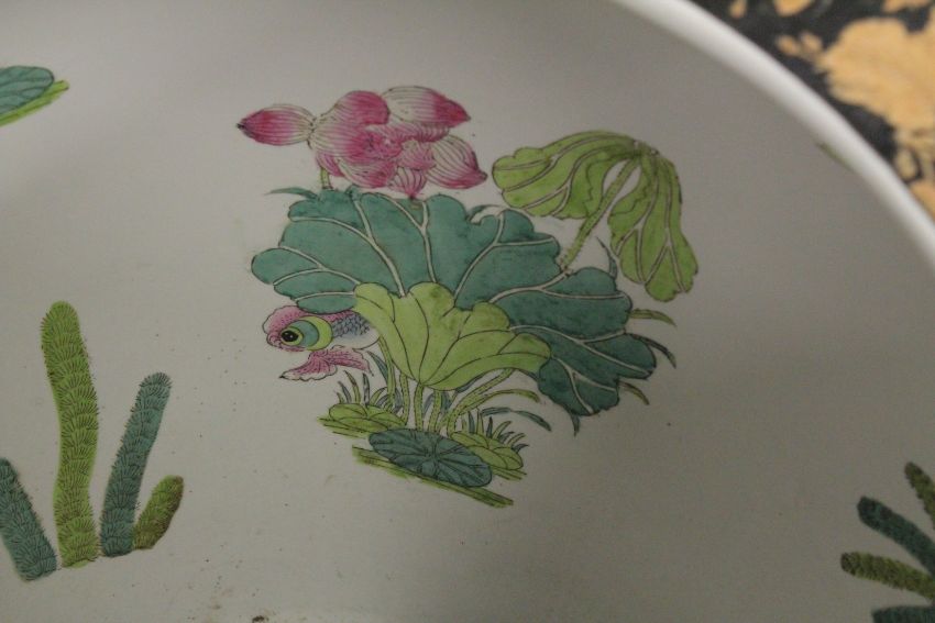 A LARGE PAIR OF CHINESE PORCELAIN FISH TANKS on wooden bases, Famille Noire with scrolls and figures.