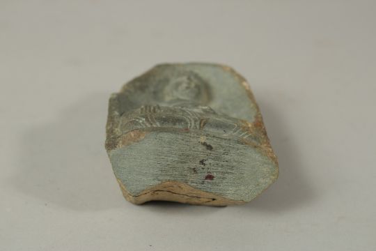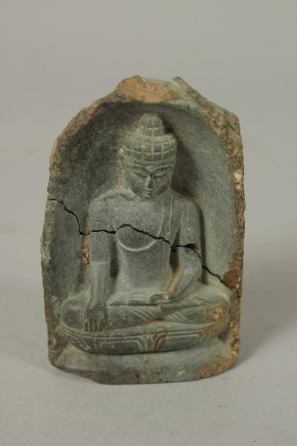 AN ENGRAVED GREY SCHIST STONE CARVING OF BUDDHA.