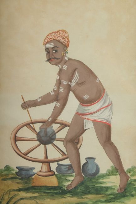 A LARGE EARLY 19TH CENTURY INDIAN WATERCOLOUR PAINTING, depicting a potter, framed and glazed, image 38.5cm x 25cm.