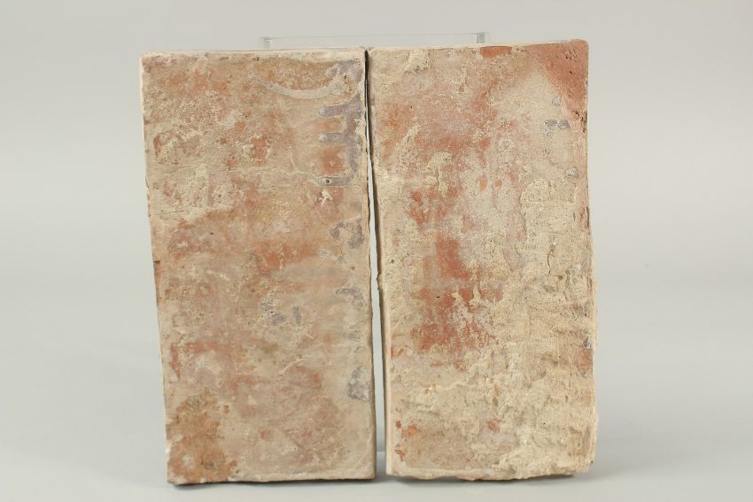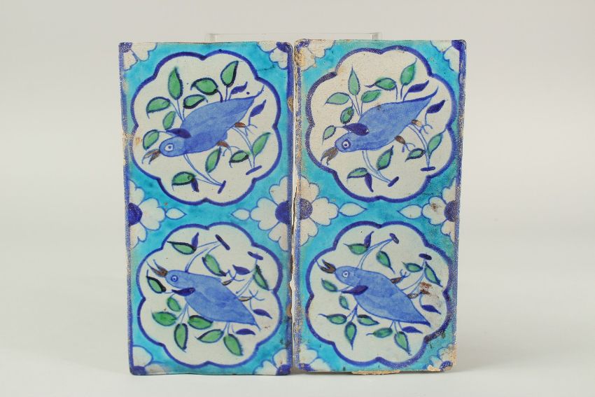 A PAIR OF 19TH CENTURY INDIAN OR NORTH INDIAN MULTAN GLAZED POTTERY TILES, with bird designs, 30cm x 15cm.