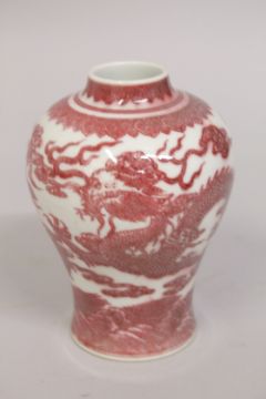 A CHINESE UNDERGLAZE RED AND WHITE PORCELAIN DRAGON VASE, with six-character mark to base, 16cm high.