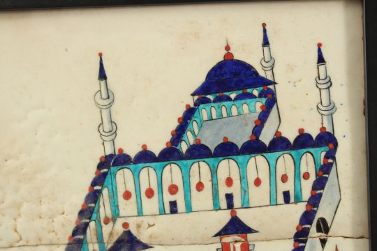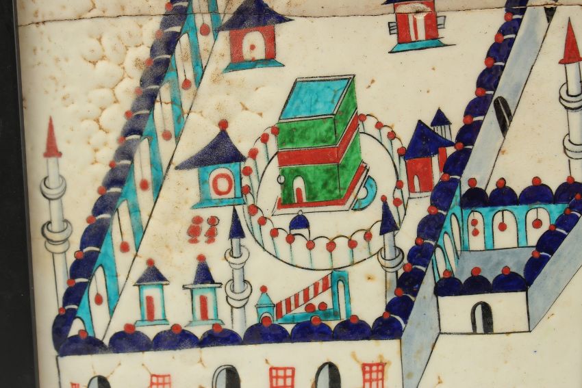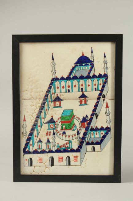 A FINE AND LARGE 19TH-20TH CENTURY OTTOMAN KUTAHYA FRAMED TILE, depicting Ka'aba, 40cm x 30cm overall.