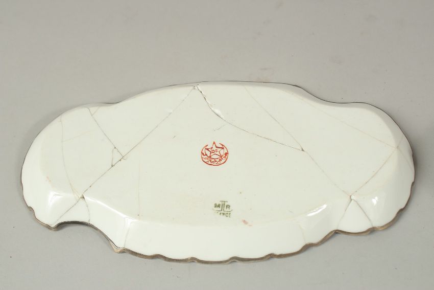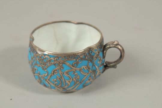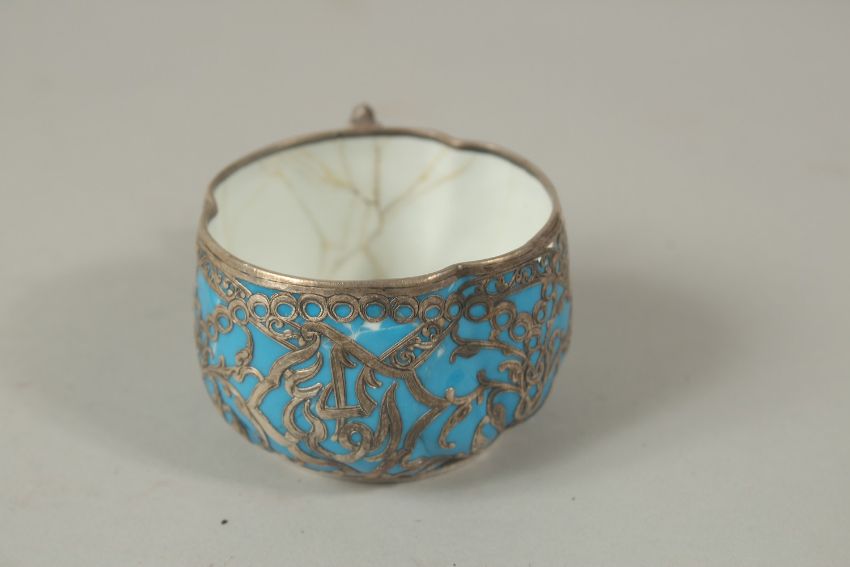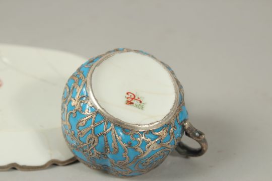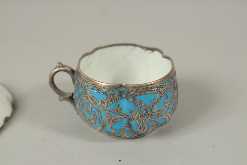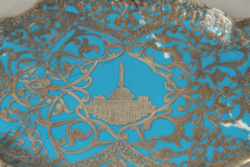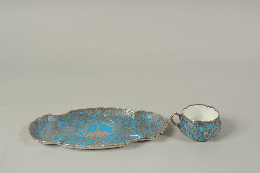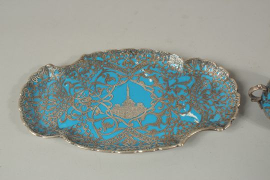 A VERY FINE 19TH CENTURY OTTOMAN TURKISH SILVER MOUNTED YILDIS TRAY depicting a mosque in the centre, 23.5cm long, together with a similar cup, (af).
