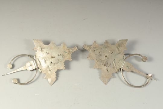 TWO FINE LARGE NORTH AFRICAN MOROCCAN OR ALGERIAN ENAMELLED SILVER CLOAK ORNAMENTS, 18.5cm long (2).