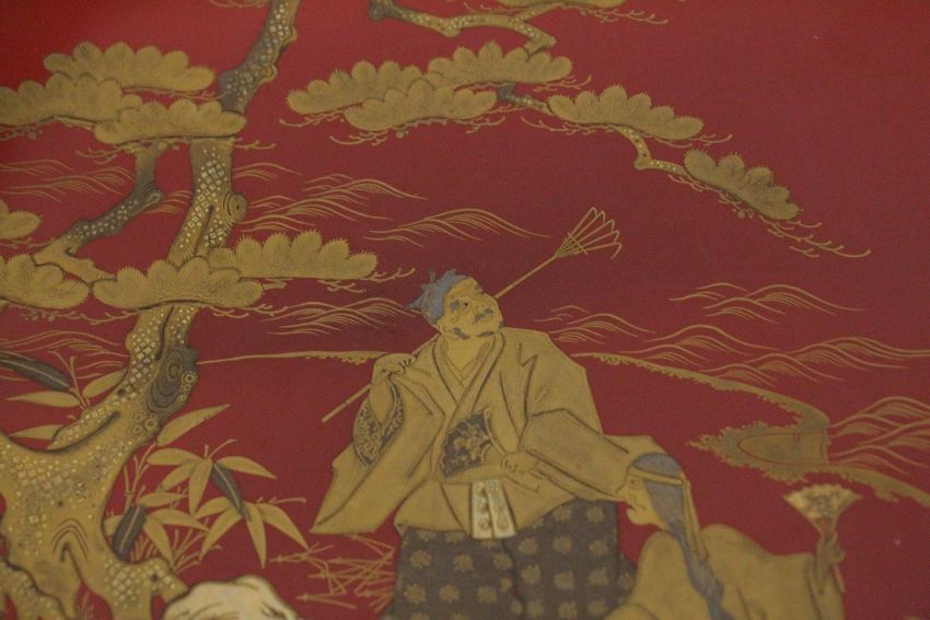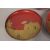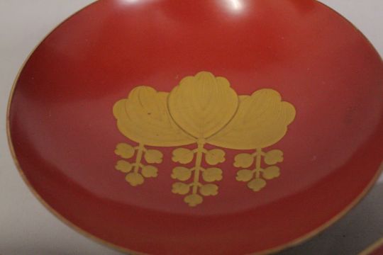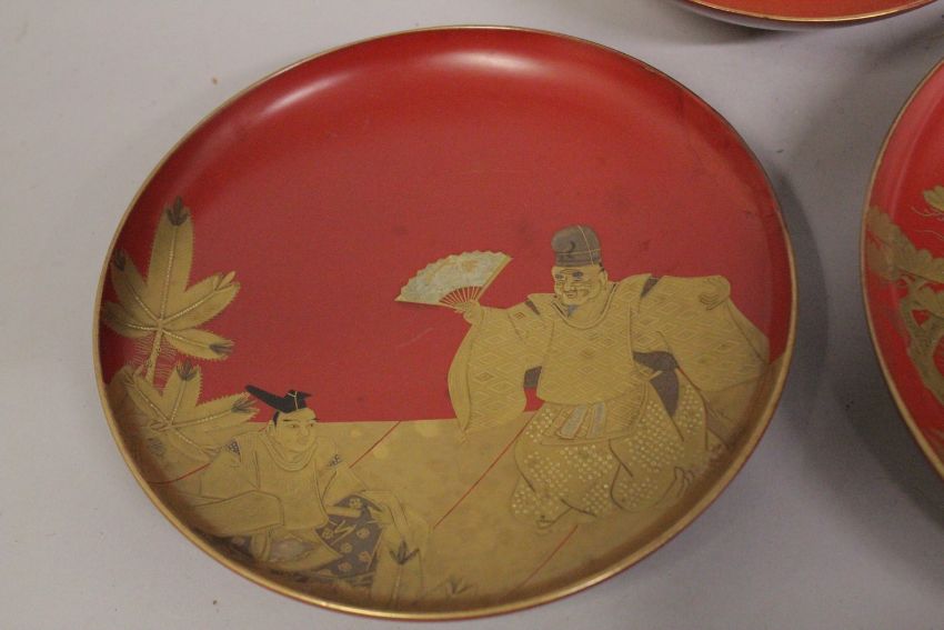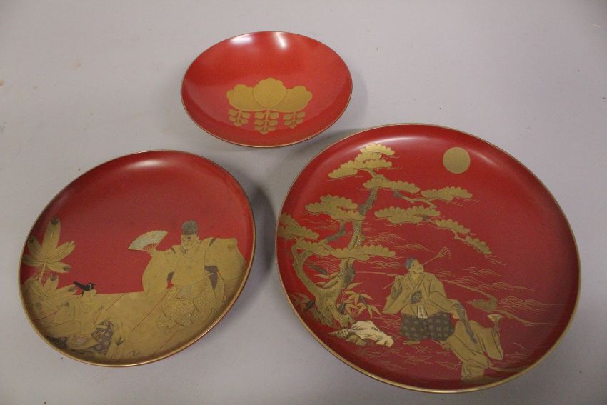 THREE JAPANESE GILT AND RED LACQUER SAKE DISHES, two depicting scenes of figures - both signed, the other with central foliate motif, largest 18cm diameter, (3).