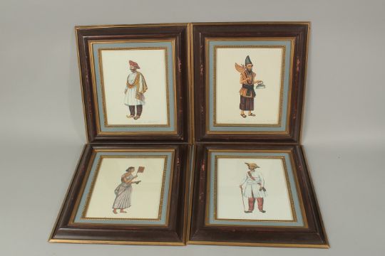 A SET OF FOUR FRAMED INDIAN CONEMPORARY INDIAN COMPANY SCHOOL STYLE PRINTS, (4).