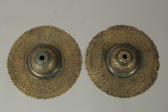 A PAIR OF 12TH-13TH CENTURY PERSIAN SELJUK KHURASSAN ENGRAVED BRONZE DOOR BOSSES, each 16cm diameter.