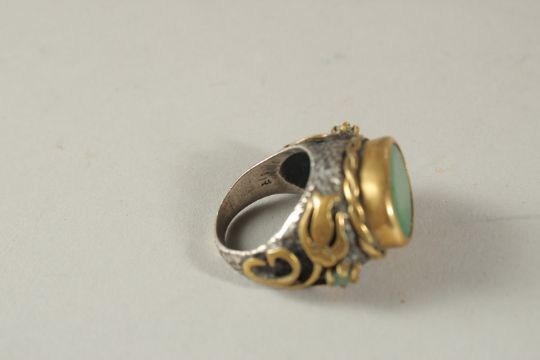 AN OVAL GREEN-STONE INSET MIXED METAL RING.