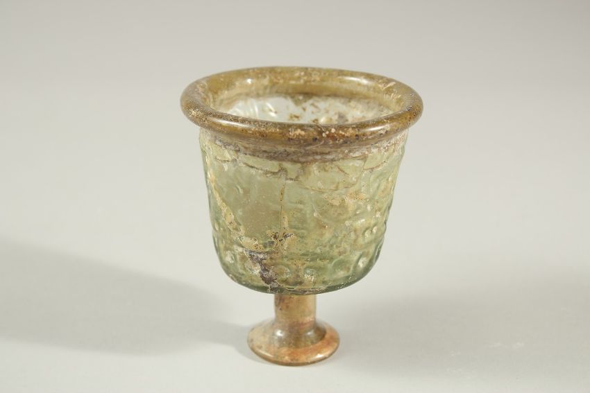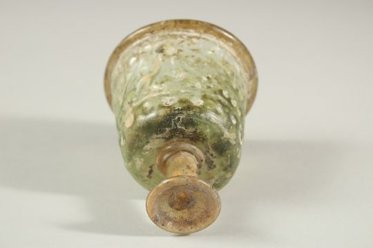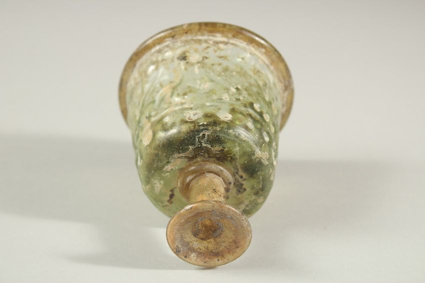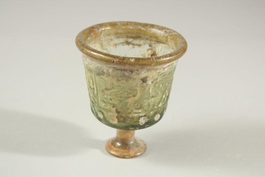 A RARE 10TH-12TH CENTURY ISLAMIC POSSIBLY PERSIAN MOULDED GLASS STEM CUP, with Kufic calligraphy designs, 9cm high.