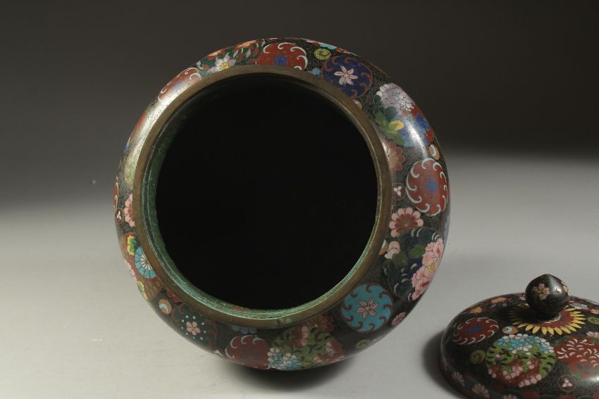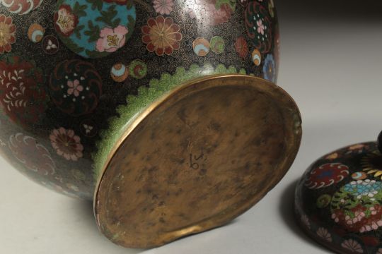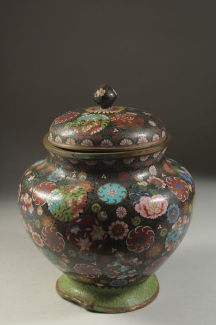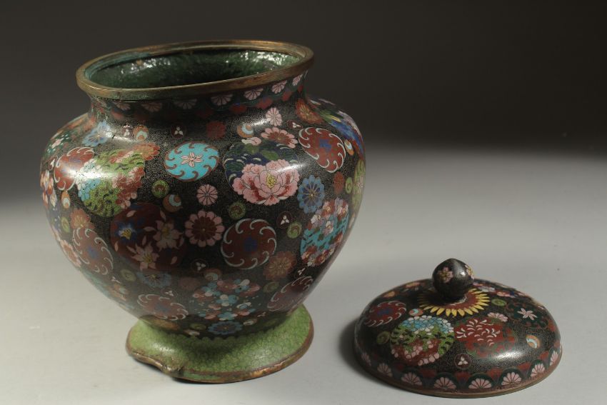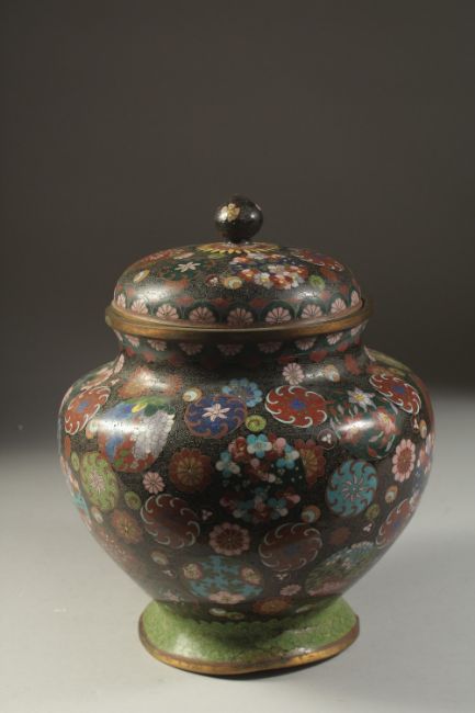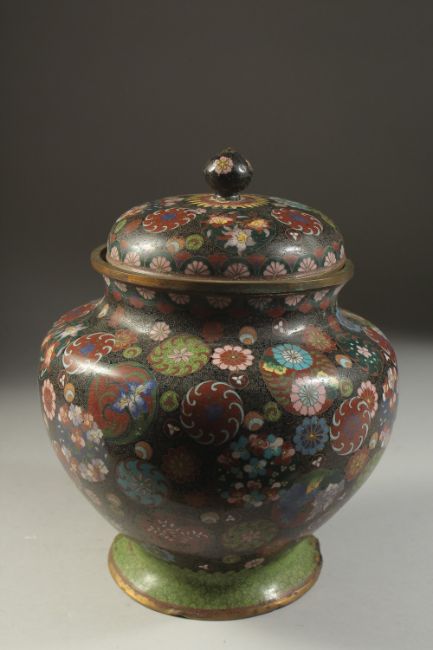 A LARGE JAPANESE CLOISONNE LIDDED JAR, 27cm high.