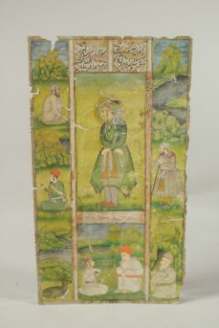 A VERY FINE 17TH-18TH CENTURY MUGHAL INDIAN MINIATURE PAINTING, depicting a ruler surrounded by other figures, 16cm x 11cm.