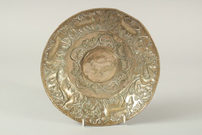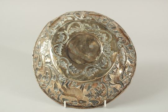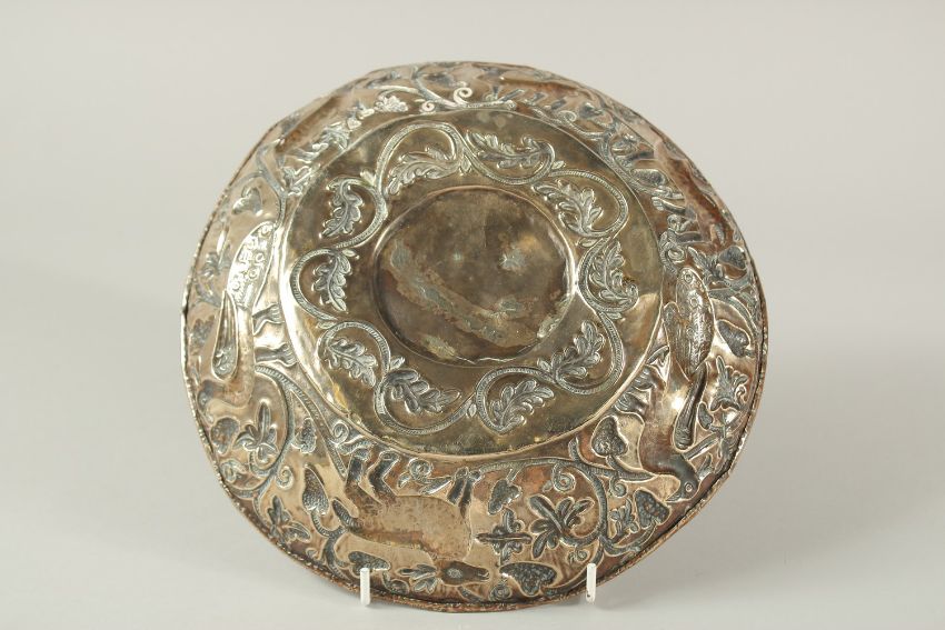 A RARE POSSIBLY EARLY PERSIAN SASSANIAN STYLE WHITE METAL DISH, embossed with animals, 24cm diameter.