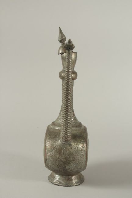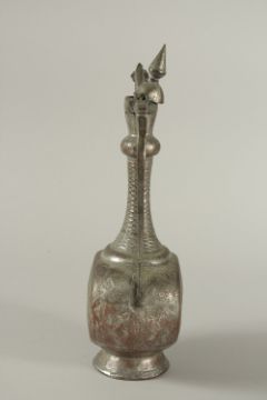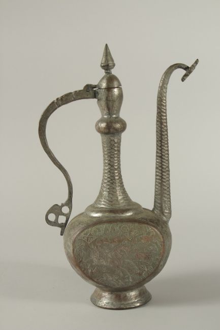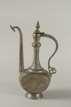 A 19TH CENTURY PERSIAN QAJAR TINNED COPPER EWER, engraved with hunting scenes, 35cm high.