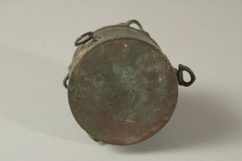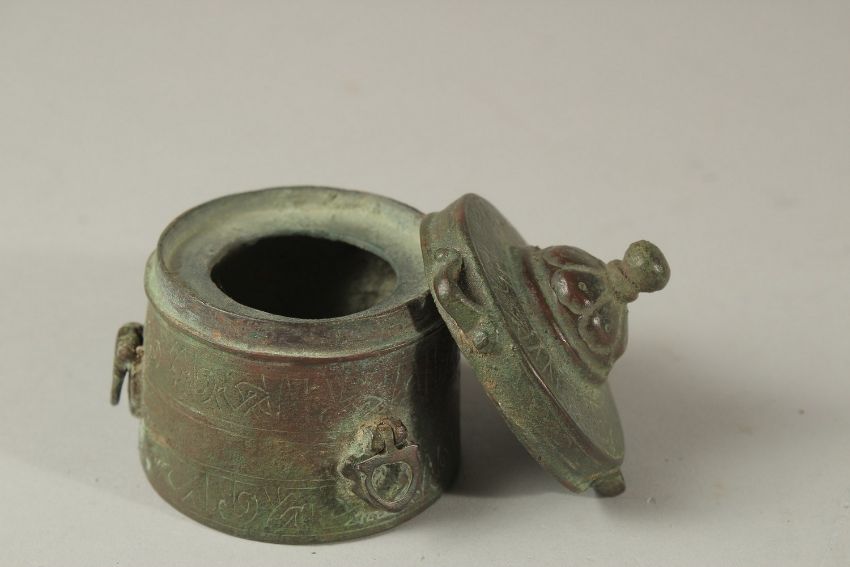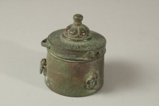 A RARE 12-13TH CENTURY PERSIAN SELJUK KHURASAN BRONZE INKWEL WITH KUFIC CALLIGRAPHY, 7.5cm high.