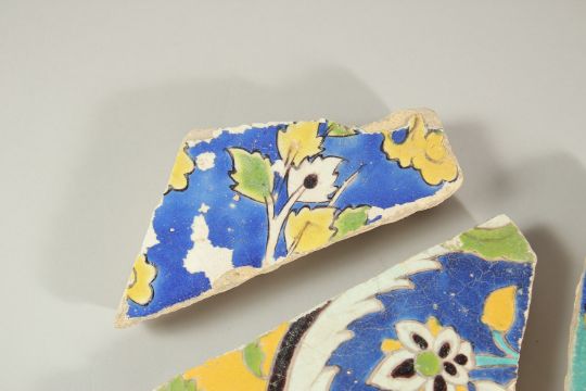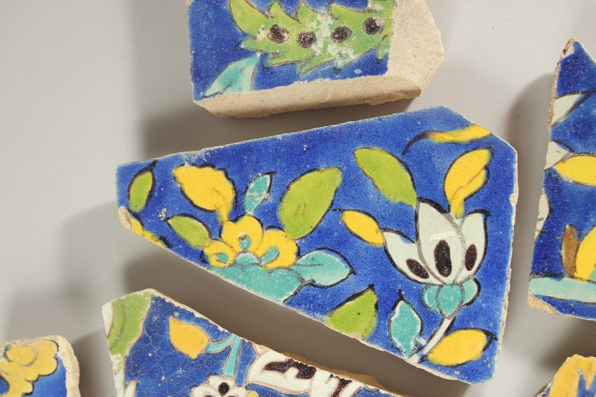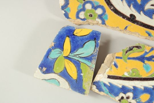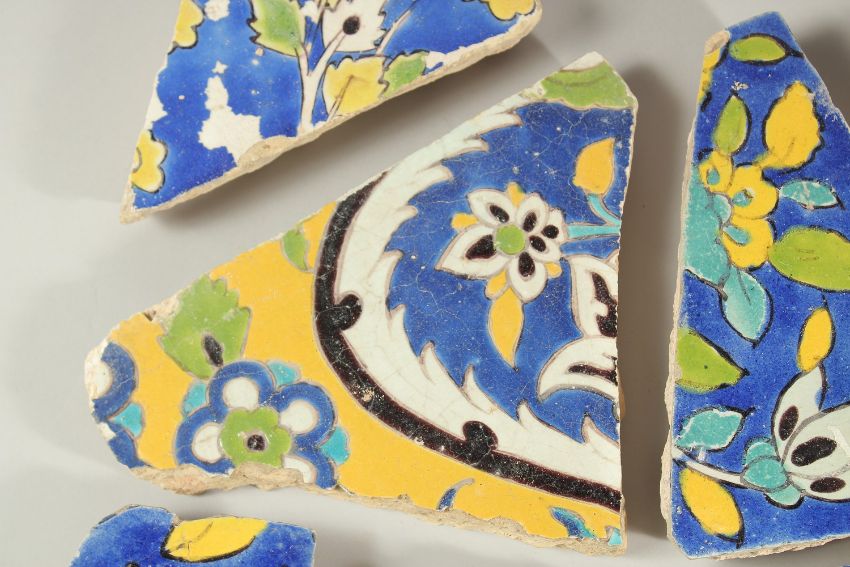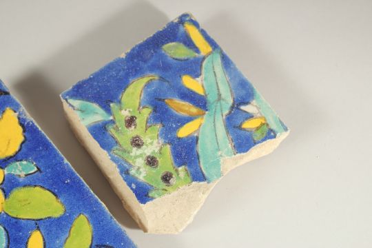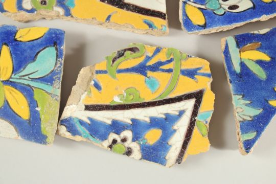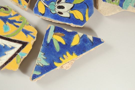 A COLLECTION OF SEVEN 17TH CENTURY PERSIAN SAFAVID TILE FRAGMENTS, largest 23cm wide (7).