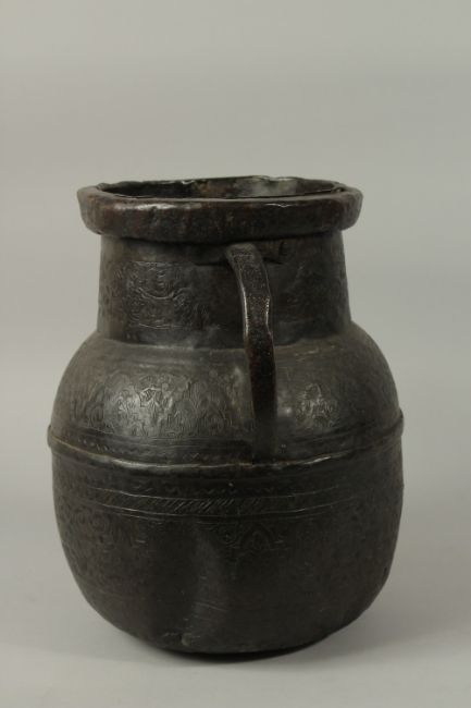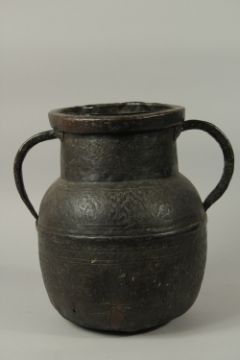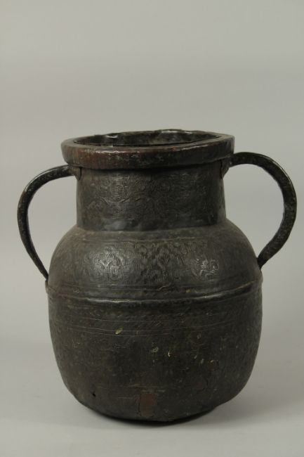 A LARGE EARLY ISLAMIC POSSIBLY SPANISH ADALUSIAN ENGRAVED TWIN HANDLE COPPER JAR, 35cm high.