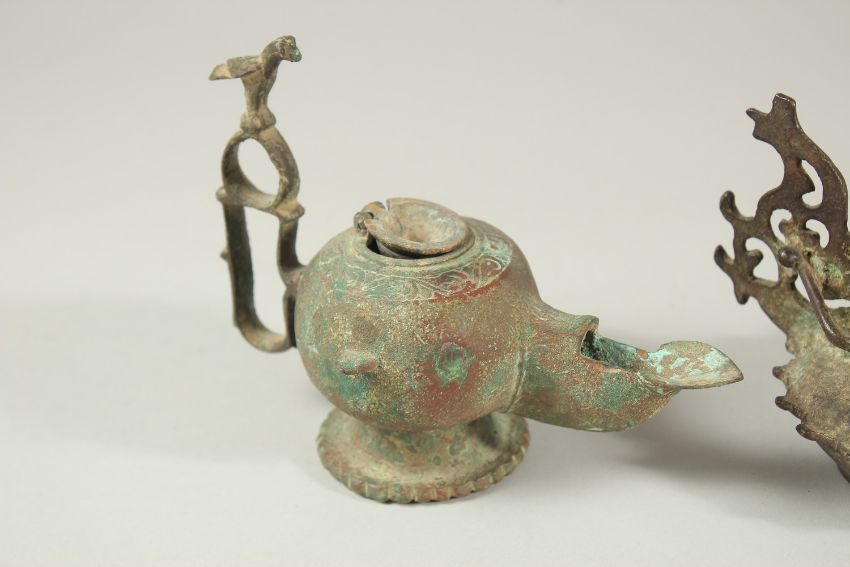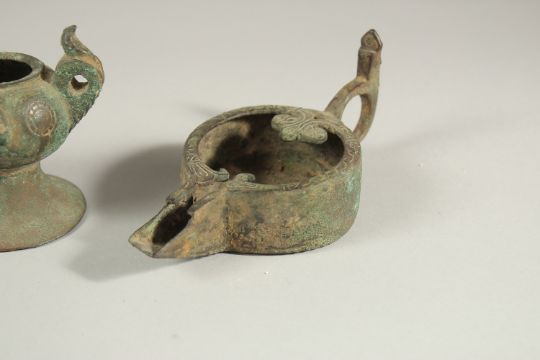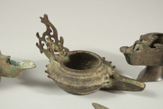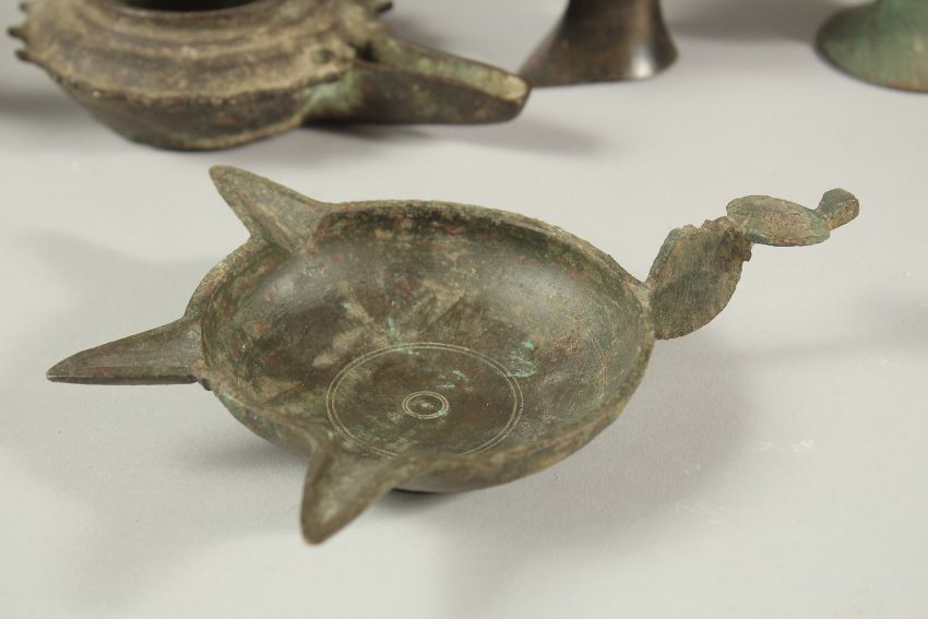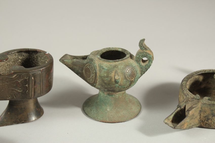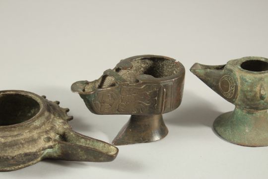 A COLLECTION OF SIX EARLY ISLAMIC PERSIAN 10TH-12TH CENTURY BRONZE OIL LAMPS, of various forms, (6).
