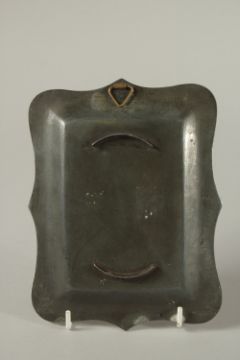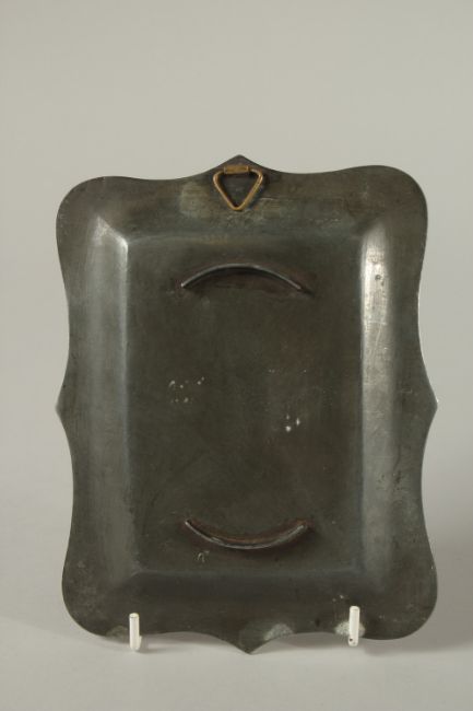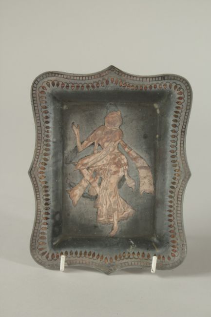 A 19TH CENTURY BIDRI SILVER INLAID TRAY DEPCITNG A DANCING FEMALE, 18cm x 14cm.