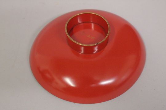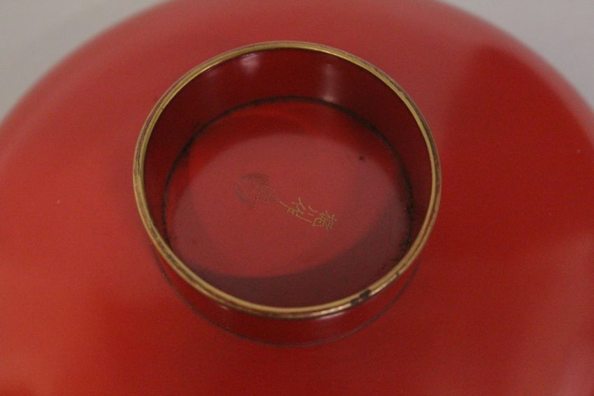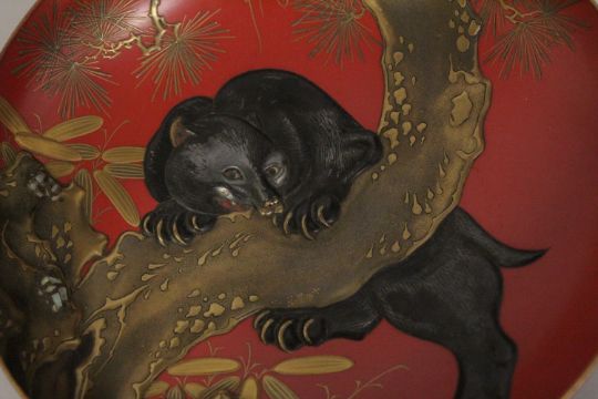 A VERY FINE 19TH CENTURY JAPANESE MEIJI RED AND GILT LACQUER SAKE DISH, depicting a bear behind a tree, embellished with fine two-tone gilded highlights, signed to the base with red lacquer pot type seal, 15cm diameter.