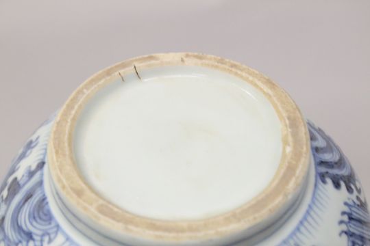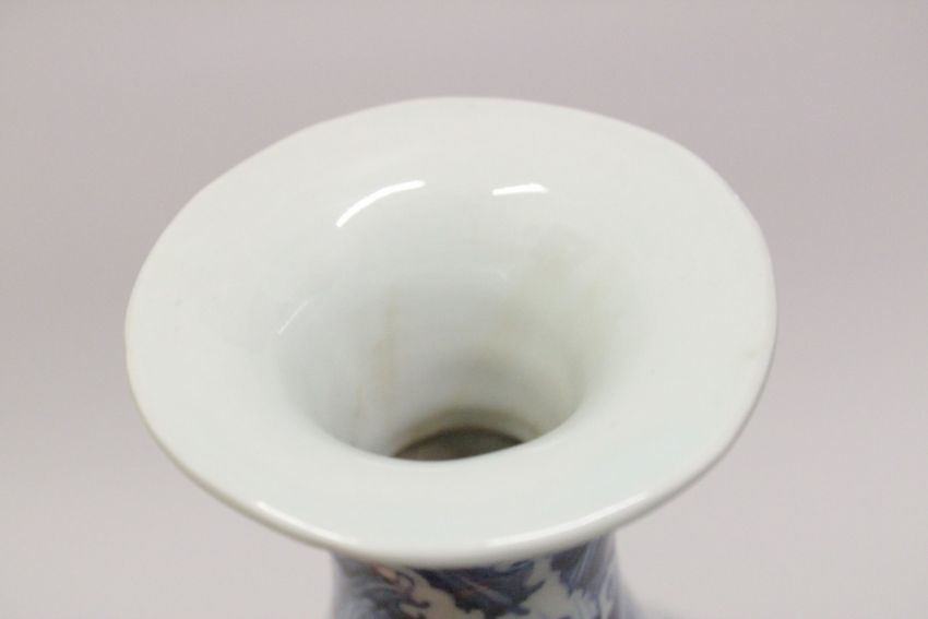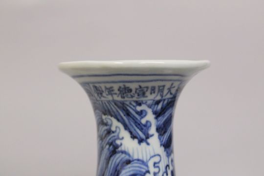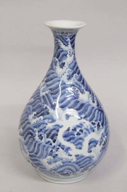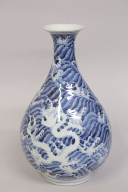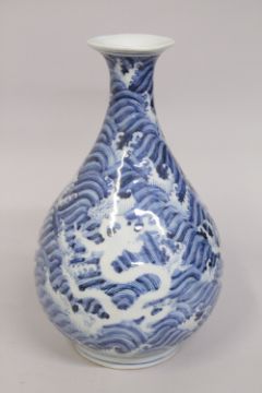 A CHINESE BLUE AND WHITE PORCELAIN DRAGON VASE, decorated with white dragons on a pattern of stylised waves, 30cm high.