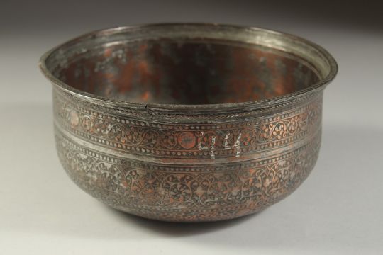 A FINE 18TH-19TH CENTURY INDIAN POSSIBLY DECCANI ENGRAVED TINNED COPPER BOWL, 20cm diameter.