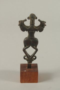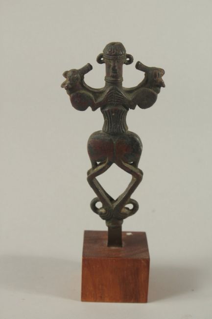 A FINE AND RARE ANCIENT PERSIAN LURISTAN BRONZE IDOL, mounted to a wooden base, figure 12cm.