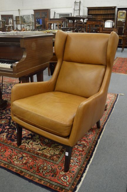 A good pair of modern tan leather upholstered wing armchairs.