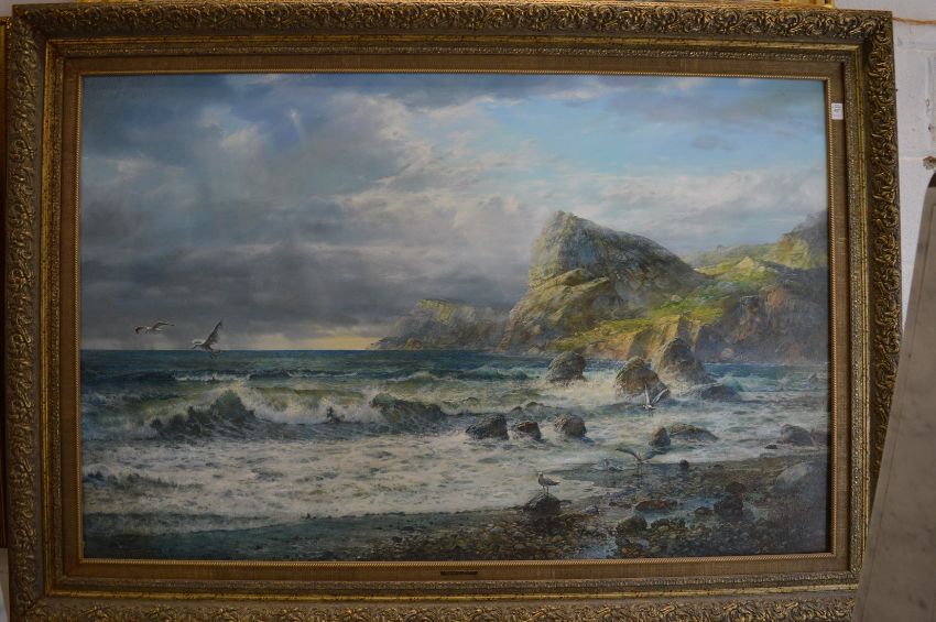 Mikhail Anatolyevich, large oil on canvas depicting a coastal view with seagulls, painting size 90cm x 140cm.