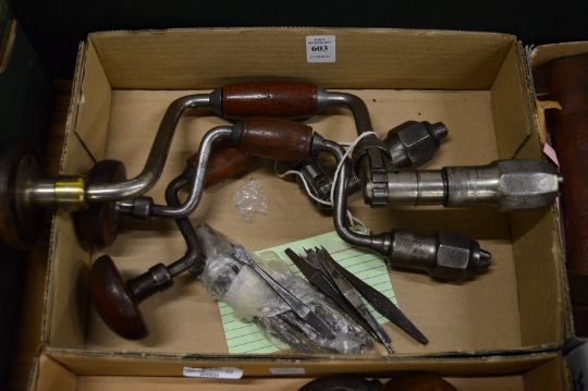 Three vintage wood working braces by J A Chapman together with a collection of bits.