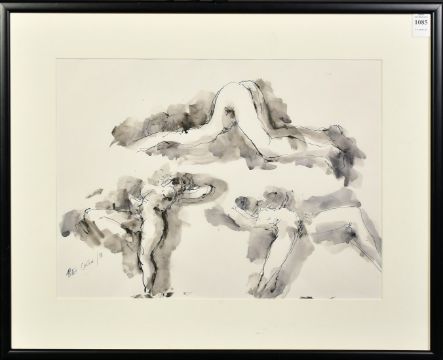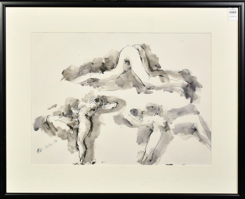Peter Collins (b. 1935), study of a female nude in three positions, ink and watercolour, signed and dated 98, 12" x 16" (30 x 40cm).