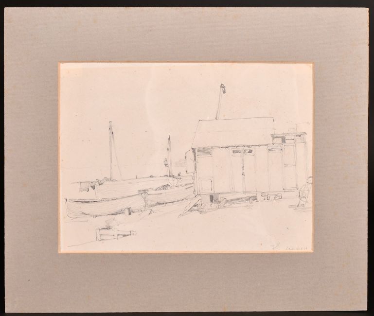Frank Short (1857-1945) - Three pencil sketches - "Deal", scene showing fishermen's huts and fishing boats pulled up onto the beach, initialled, titled and dated 22.8.21, 8.75ins x 11.5ins, "Kingsdown", initialled and titled, 9.25ins x 12ins, and "Kingsdown", a similar view to the preceding, initialled and titled, 8.5ins x 11.25ins, all unframed, (3).