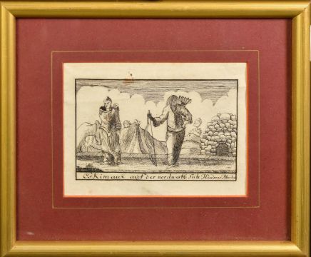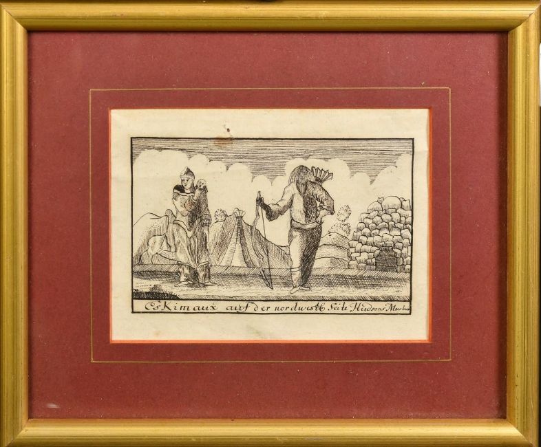 Early 19th Century probably Canadian School, 'Eskimaux Auf Der Nordwest Seite Hudson's Harbour', ink drawing, an Eskimo family near a dwelling, 4.5" x 6.25" (11.5 x 16cm).