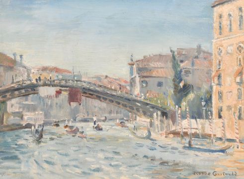 Jeanne Courtauld (1909-2009) - Oil painting - "The Accademia Bridge, Venice", signed, board 10.25ins x 14.25ins, in gilt frame and glazed Note: With various handwritten labels to verso giving title, date September 1969, and artist's details.