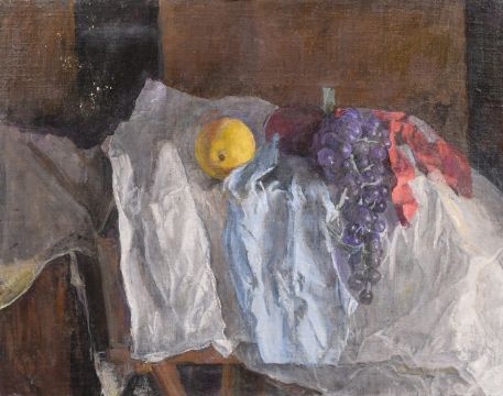 Georges Weissbort (1928-2013), a still life with grapes and a lemon 14" x 18" (36 x 46cm), along with another still life with a bugle, 13" x 16" (33 x 40cm), unframed, (2).