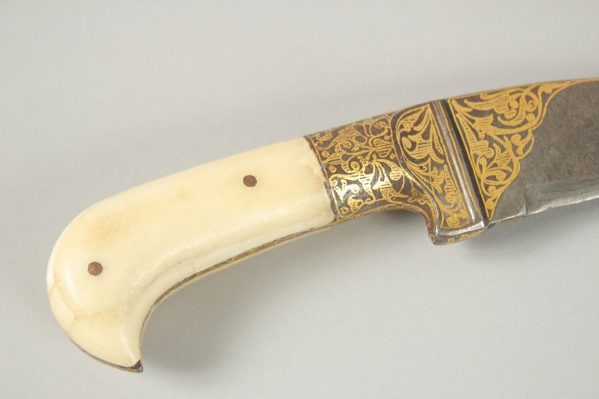 A FINE INDIAN BONE HILTED AND GOLD OVERLAID WATERED STEEL DAGGER, 28.5cm long.