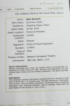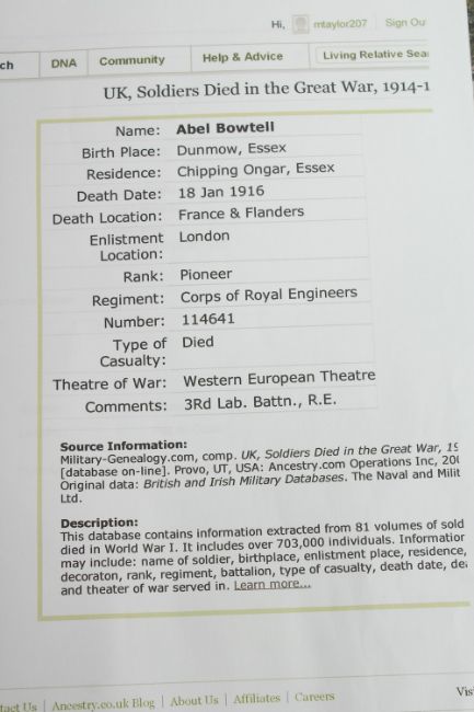 ABEL BOWTELL. R. E. CORPS OF ROYAL ENGINEERS. 114641 PIONEER. Died 18th January 1916, aged 44. HENU CHURCHYARD. TRIO with ribbons.