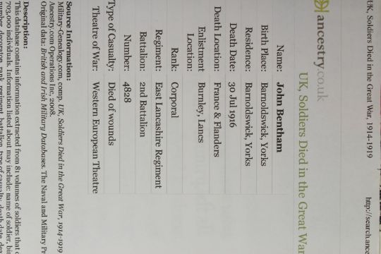 CORPORAL JOHN BENTHAM 4828. 2nd BATTALION EAST LANCASHIRE REGIMENT who died on 30th July 1916, aged 22. BRONZE DEATH PLAQUE, SCROLL and PHOTO OF GRAVE.