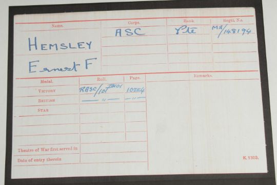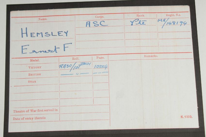 ERNEST F. HELMSLEY. ARMY SERVICE CORPS. PTE 148194. DUO with ribbon.