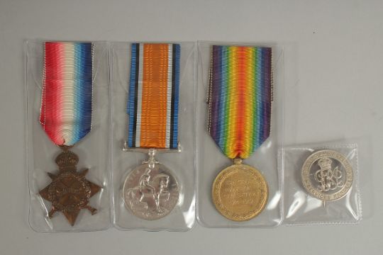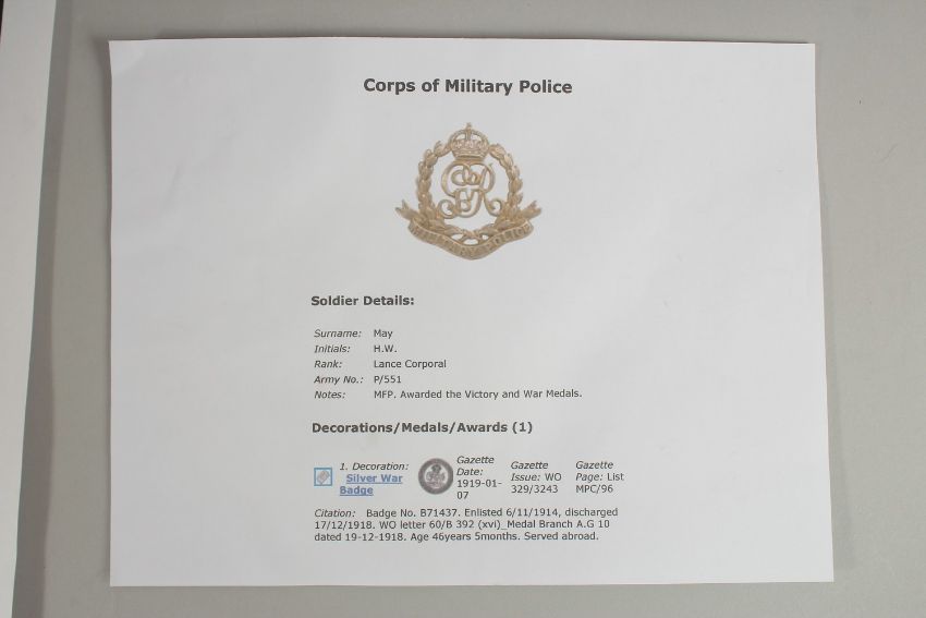 HENRY W. MAY. MILITARY FOOT POLICE. L/CPL P551. TRIO with ribbons and badge. KING'S BADGE. 1914 - 1915 Star.