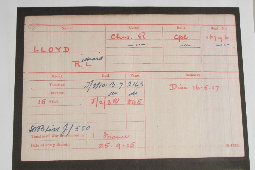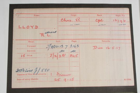RICHARD L. LLOYD. CHESHIRE REGIMENT. L/SGT 16796. WOUNDED. TRIO with ribbons and paperwork. 1914 - 1915 Star.