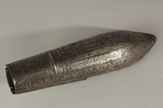 A 17TH CENTURY SOUTH INDIAN DECCANI STEEL ARM GUARD, 34cm long.