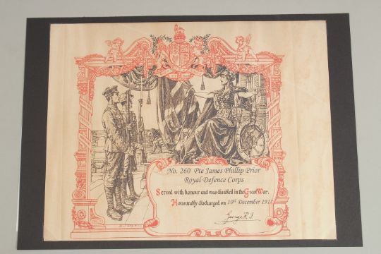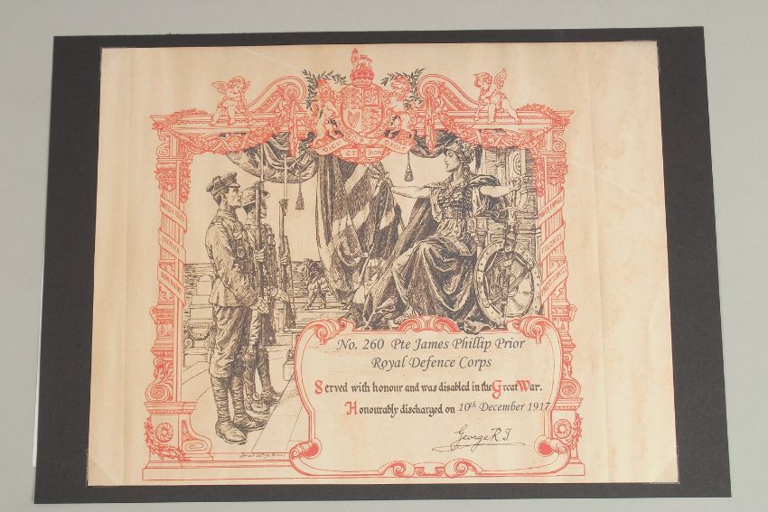 PTE JAMES PHILLIP PRIOR 260. ROYAL DEFENCE CORPS. Honourable Discharge 10th December 1917.