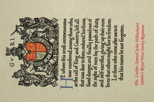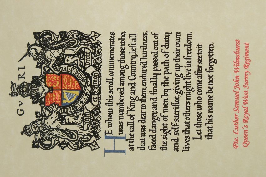 PRIVATE LUTHER SAMUEL JOHN WILMSHURST 24547. 7th BATTALION THE QUEEN'S (ROYAL WEST SURREY REGIMENT) who died on 18th July 1917, aged 21. BRONZE DEATH PLAQUE and SCROLL.