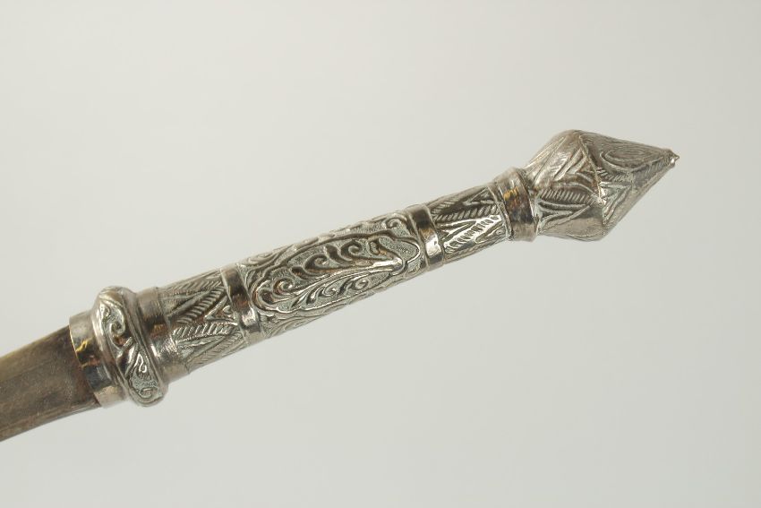 AN INDIAN SHORT SWORD with engraved black and silver handle and sheath.