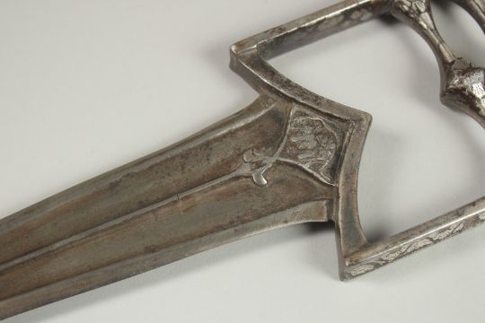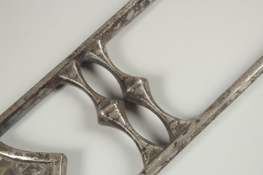 A FINE 18TH-19TH CENTURY MUGHAL INDIAN SILVER AND GOLD OVERLAID STEEL KATAR DAGGER, with chiselled animals on the blade, 47cm long.