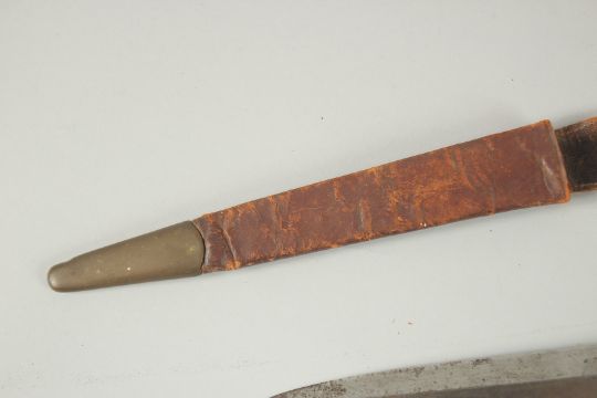 A FAIRBAIRN-SYKES TYPE COMMANDO KNIFE in a leather sheath and wire handle.