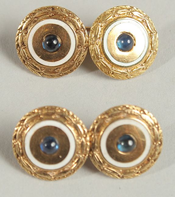 A PAIR OF EDWARDIAN 18CT GOLD SAPPHIRE AND ENAMEL CUFF LINKS.