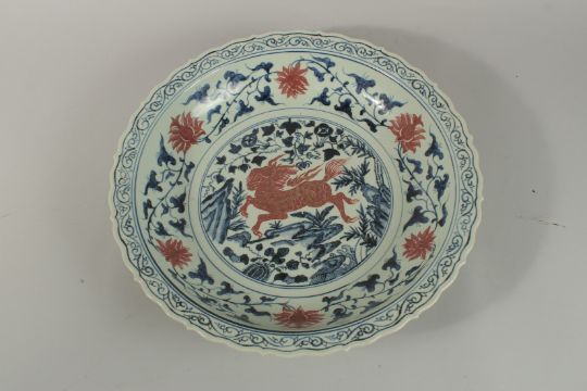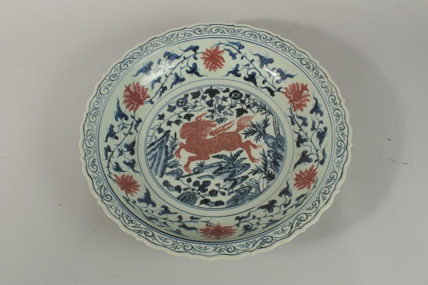 A CHINESE BLUE AND WHITE AND RED UNDER GLAZE PORCELAIN CHARGER, decorated with central panel depicting a mythical beast.