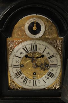 Striking on a single bell with silvered dial, fusee movement, brass finial and brass handle.
